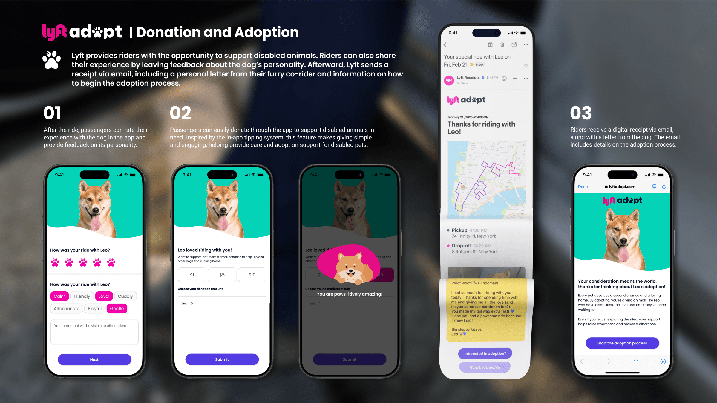 Post-ride digital receipt with donation/adoption options and a personal letter from the dog