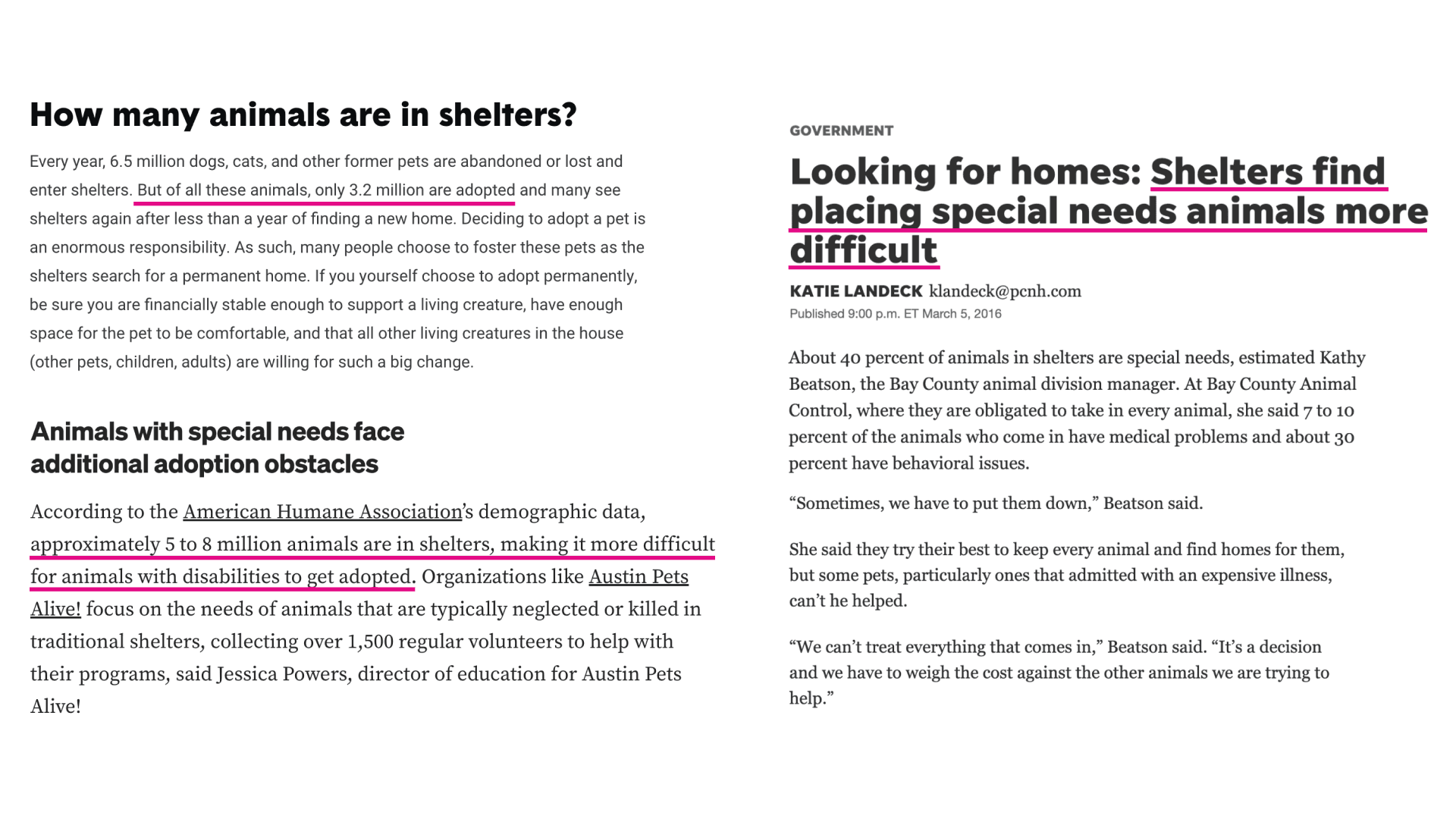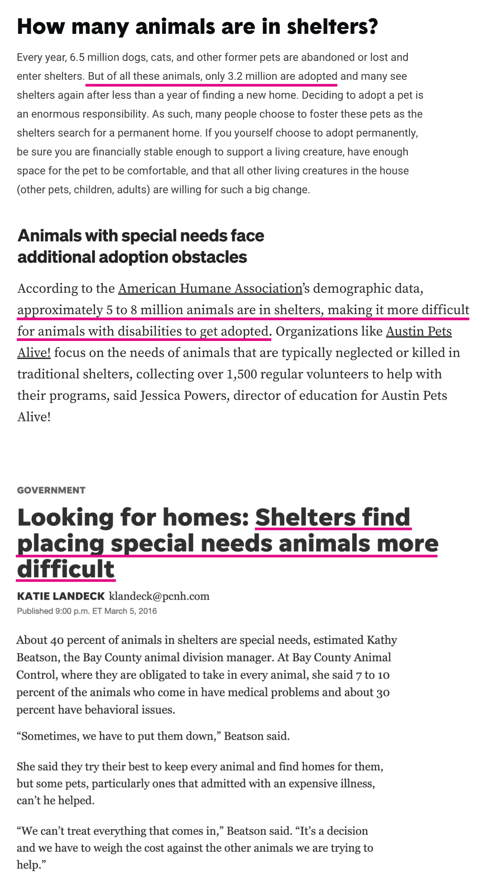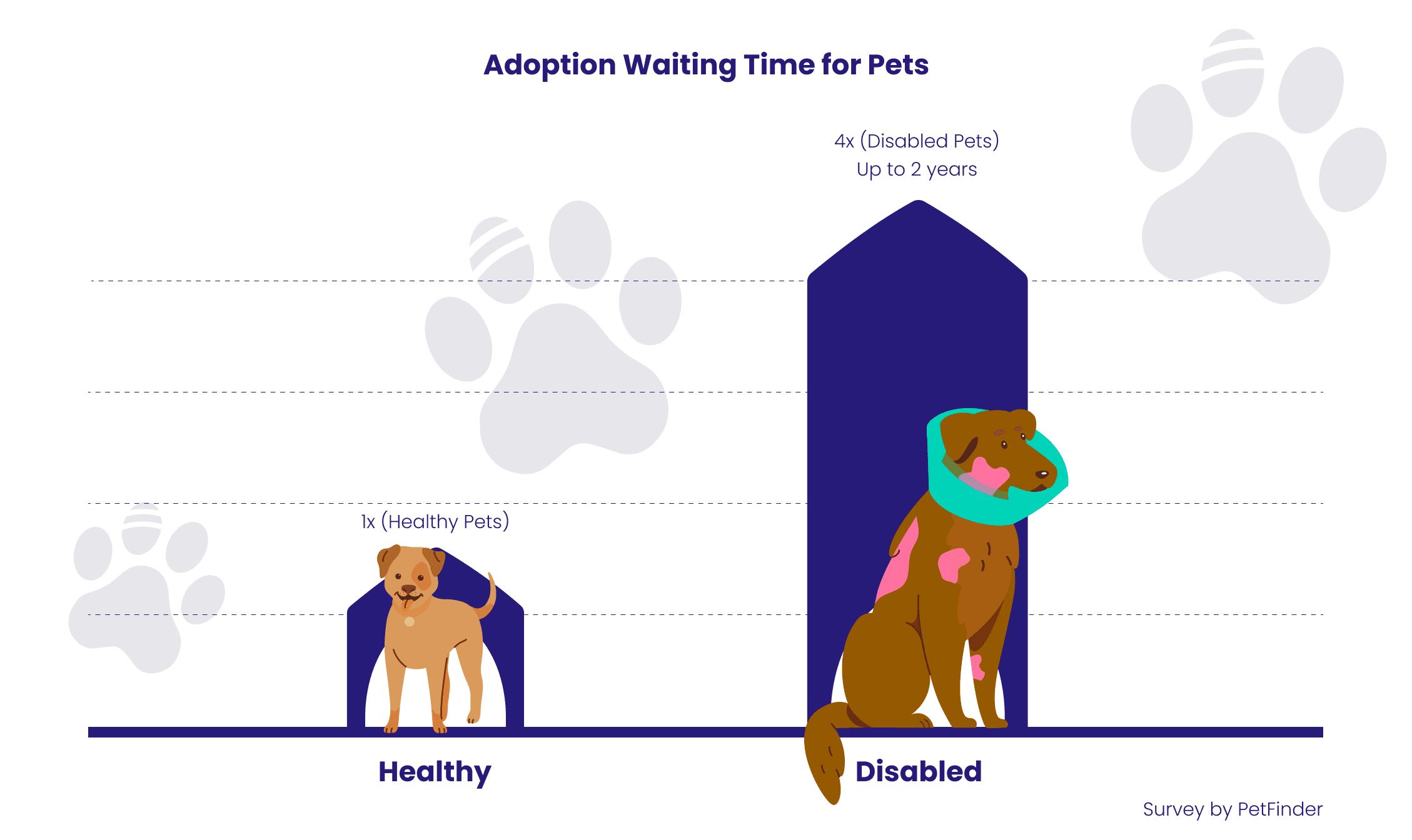 Pets with disabilities have much lower adoption rates compared to healthy pets. According to survey, it takes at least 4 times longer for pets with disabilities to be adopted, with some waiting up to 2 years.