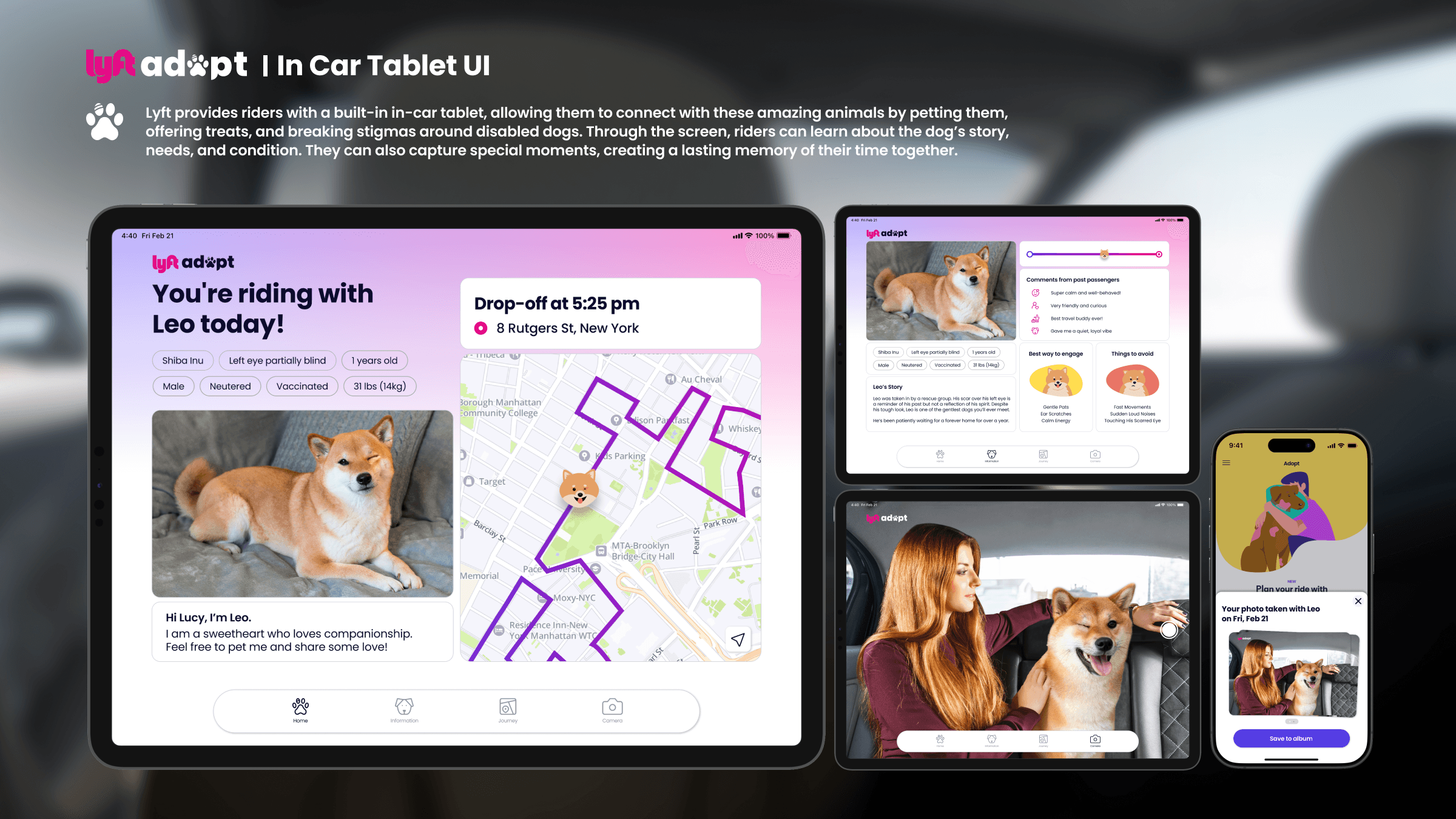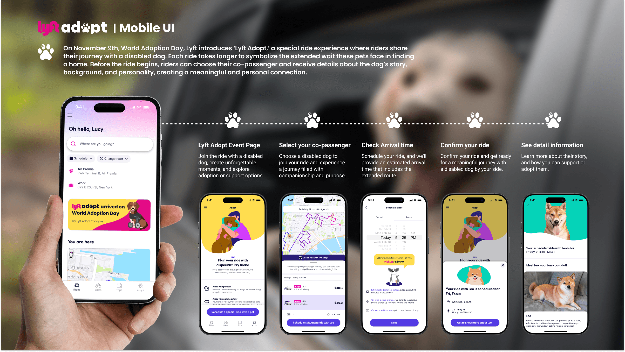 On World Adoption Day (November 9th), Lyft launches Lyft Adopt, a special ride experience where passengers share a longer-than-usual ride with a disabled dog, symbolizing the extended wait these pets face. Riders can choose their furry co-passenger and learn their story before the trip. During the ride, they can engage with the dog through in-car activities such as petting, offering treats, and learning about their background via an interactive tablet. After the ride, passengers receive a personalized email with adoption or donation options, creating a meaningful post-ride connection.